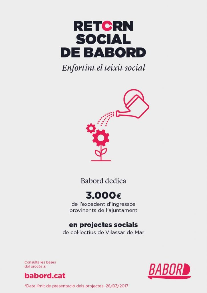 Babord destinarà un total de 3.000 €, de l’excedent d’ingressos provinents de l’Ajuntament de Vilassar de Mar, a aquesta primera acció de “Retorn social”, amb un màxim de 1.000 € per projecte.