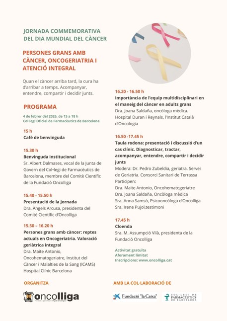 La Fundació Oncolliga va commemorar el Dia Mundial del Càncer amb la jornada “Persones grans amb càncer, oncogeriatria i atenció integral”, celebrada el 4 de febrer de 2026 al Col·legi Oficial de Farmacèutics de Barcelona (COFB), amb un programa centrat en la valoració geriàtrica integral, el treball en equips multidisciplinaris i l’acompanyament emocional.